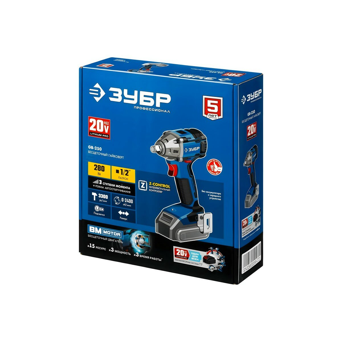 Бесщеточный гайковерт Зубр 20В без АКБ в коробке Профессионал (GB-250)