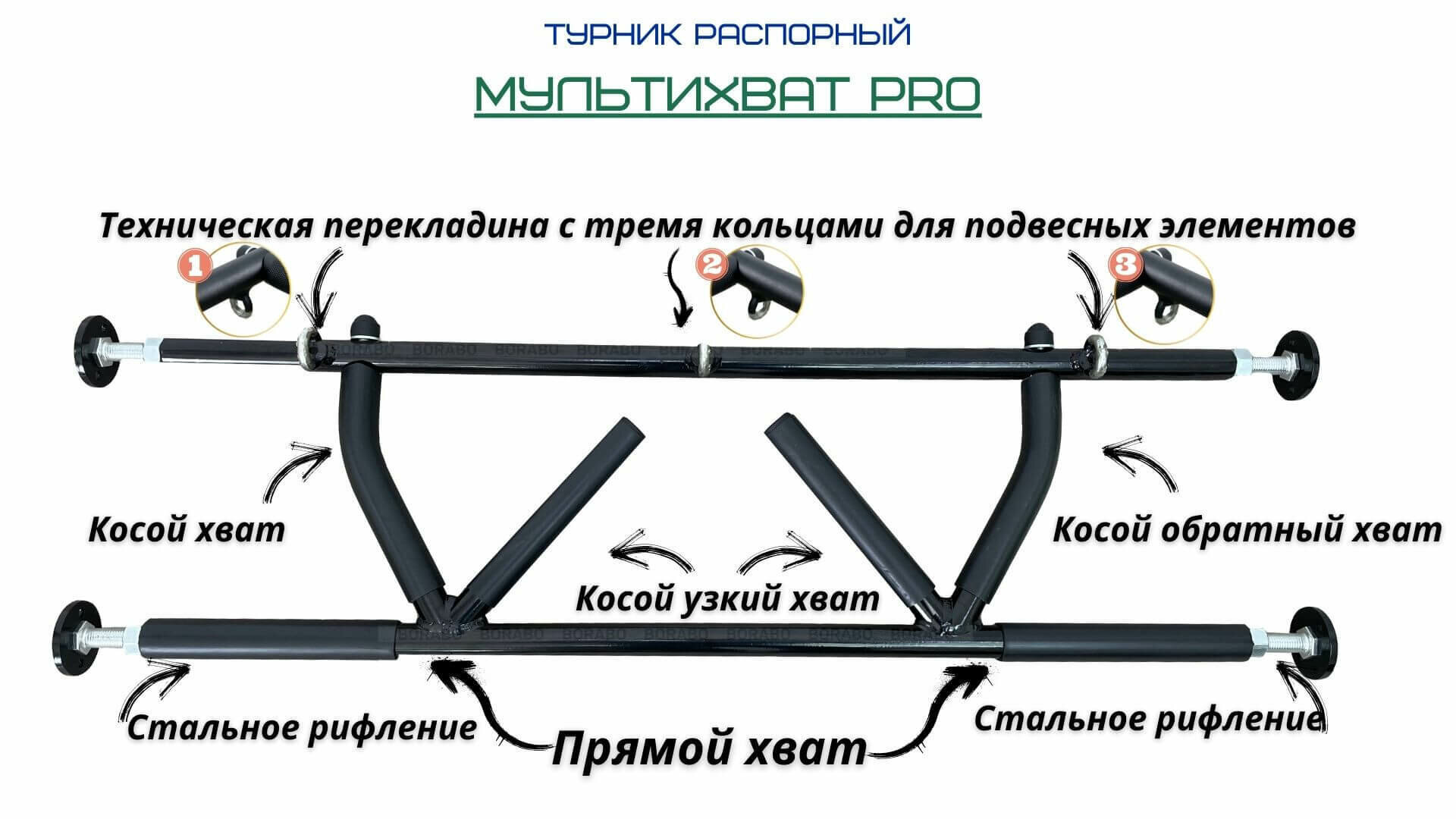BORABO Турник распорный мультихват в проем BLACK - стальное рифление