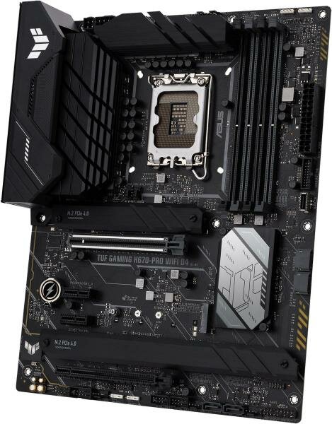 Материнская плата ASUS TUF GAMING H670-PRO WIFI D4 Socket 1700, Intel H670, 4xDDR4, PCI-E 5.0, 2500 Мбит/с, Wi-Fi, Bluetooth, 4xUSB 3.2 Gen1, 2xUSB 3.2 Gen2, USB 3.2 Gen2x2 Type-C, HDMI, DisplayPort, подсветка, ATX