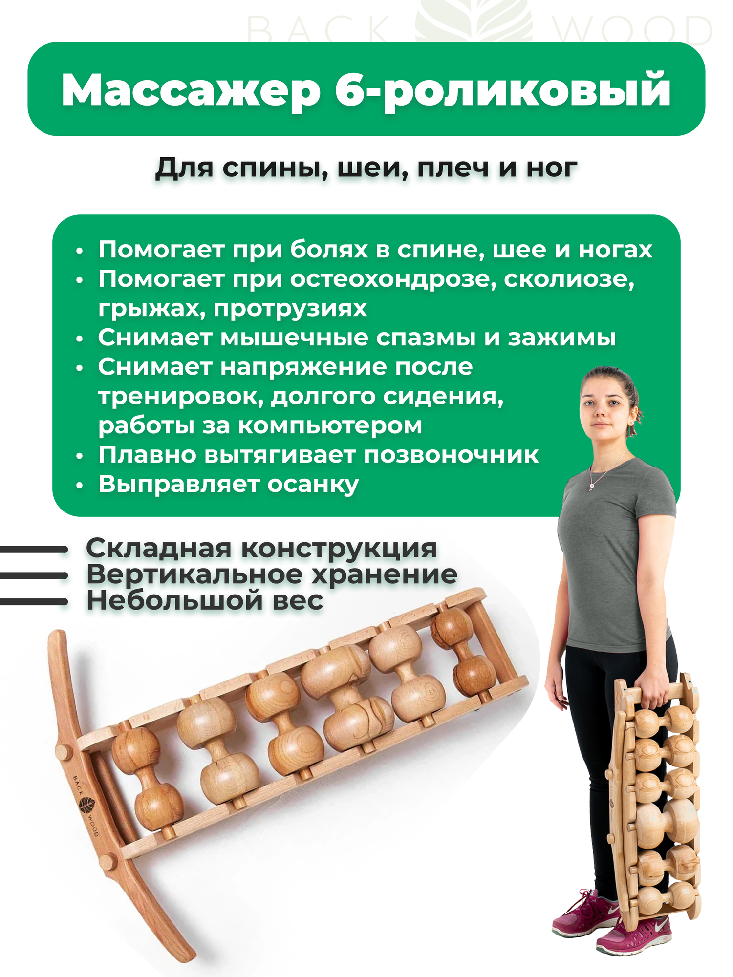 10 цен на Деревянный 6-ти роликовый массажер и тренажер для спины и всего тела"BackWooD" + Шипованный ролик