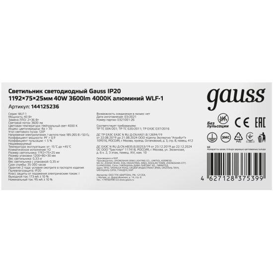 10 цен на Линейный светильник Gauss IP20 1200*72*25мм 36W 2630Лм 4000K алюминий 1/30