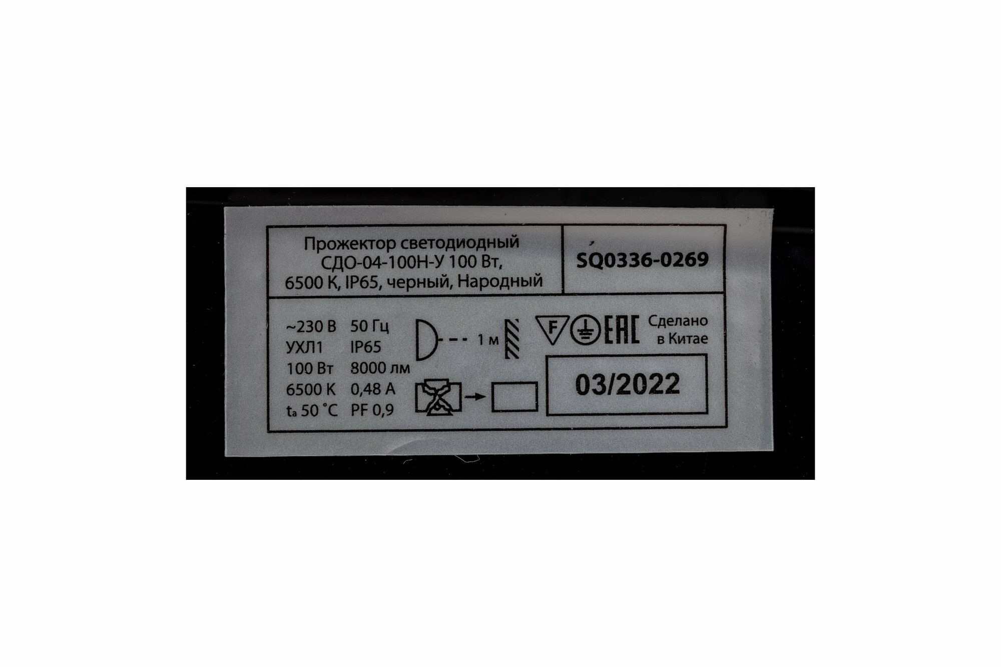 Прожектор светодиодный Народный СДО-04-100Н-У, 100 Вт, 6500 К, IP65, черный информация: