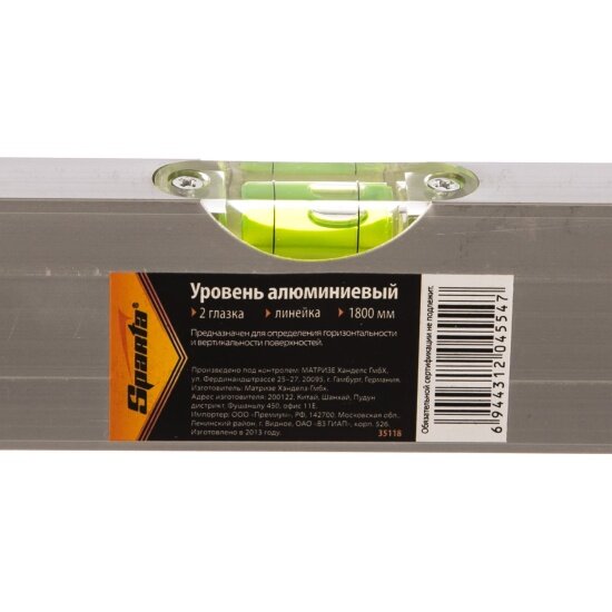 Уровень алюминиевый Sparta 35118, 1800 мм, 2 глазка, линейка информация: