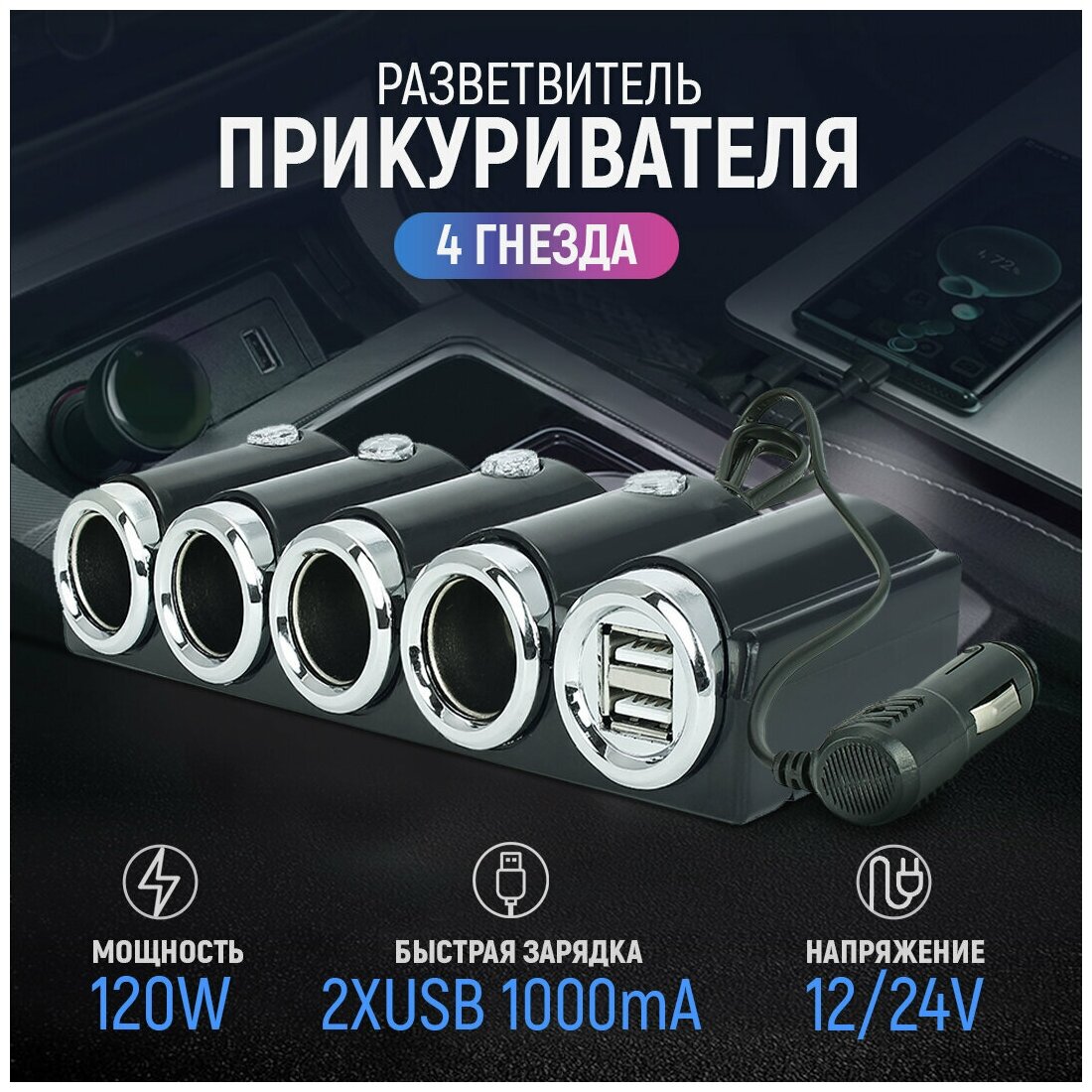 10 цен на Разветвитель прикуривателя 12/24V на 4 гнезда 120W и 2USB разъема 5V-1А, с выкл.