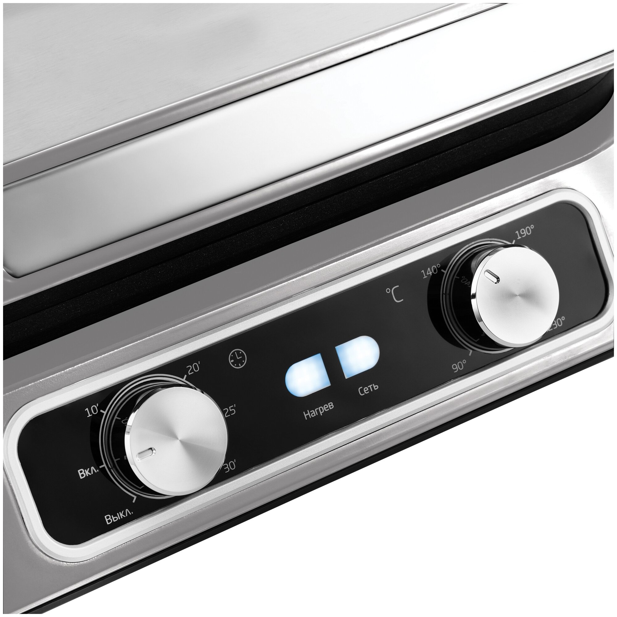 Электрогриль Pioneer GR1010E silver silk со съемными пластинами с антипригарным покрытием и поддоном, таймер, регулировка температуры, 2100 Вт