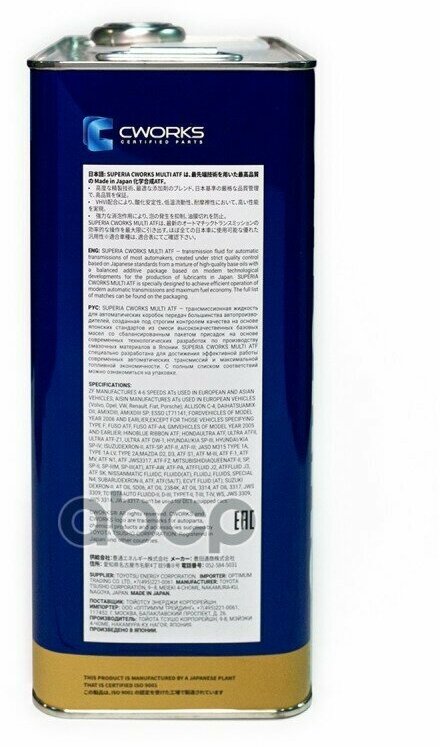 Дополнительная информация | спецификация: AUDI MULTITRONIC CHAIN CVT; BMW MINI COOPER EZL 799; DODGE/JEEP/CHRYSLER NS-2 AND CVTF+4; DAIHATSU AMMIX CVT, CVT FLUID DC AND CVT FLUID DFE; GM DEX-CVT; HONDA Z-1 ANDHMMF (*EXCEPT FIT/JAZZ OF THE 2001-2007 MODEL EQUIPPED WITH THE START CLUTCH), HCF-2; HYUNDAI/KIA CVT J1; MAZDA JWS 3320; MITSUBISHI DIAQUEEN SP-3, CVTF-J1, CVTF-J4 AND CVTF-J4+; NISSAN NS-1, NS-2 AND NS-3; SUBARU ECVT, ICVT AND LINEARTRONICS CHAIN CVT;SUZUKI CVTF TC/3320, NS-2 AND CVT GREEN 1&2; TOYOTA CVTF TC AND CVTF FE |