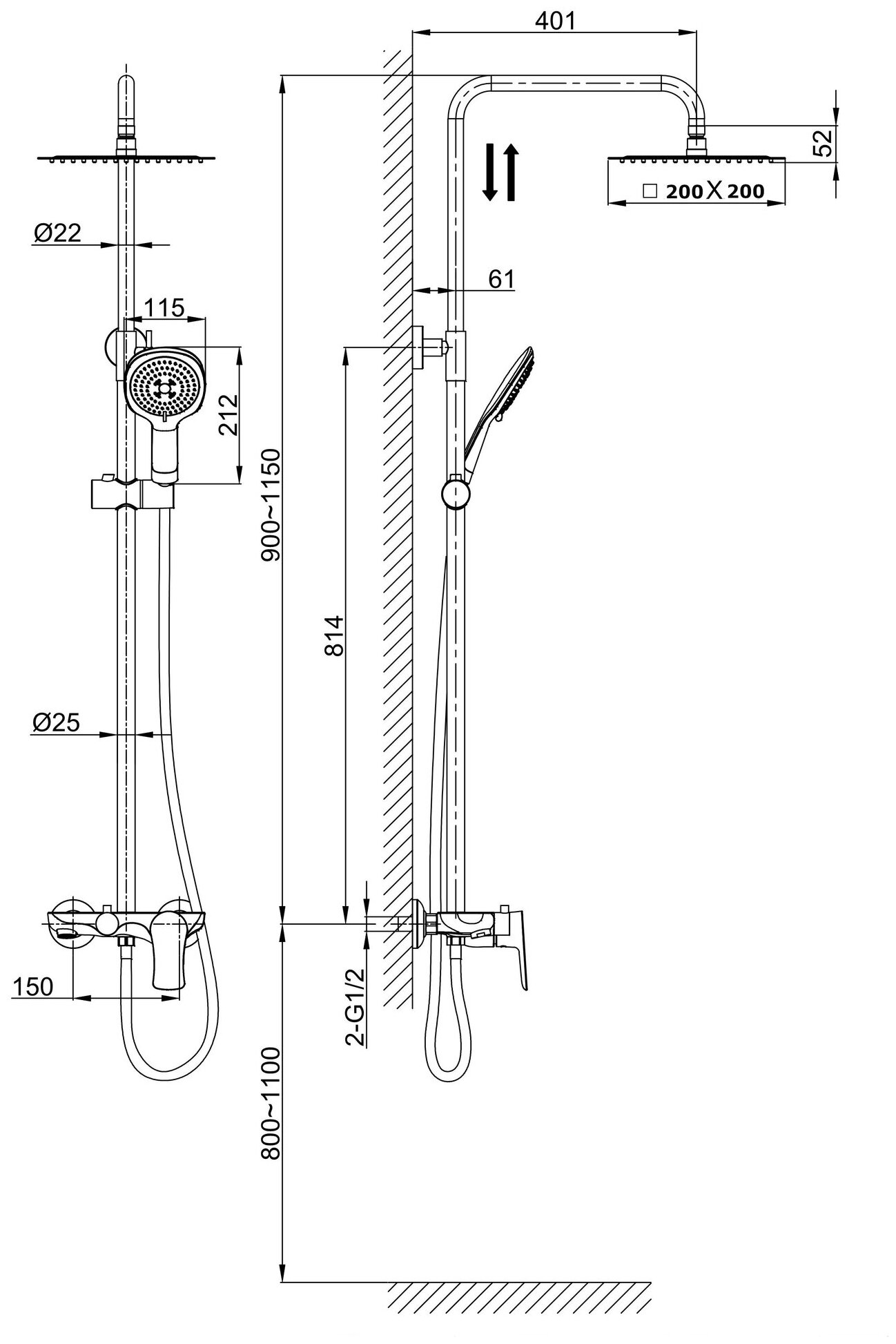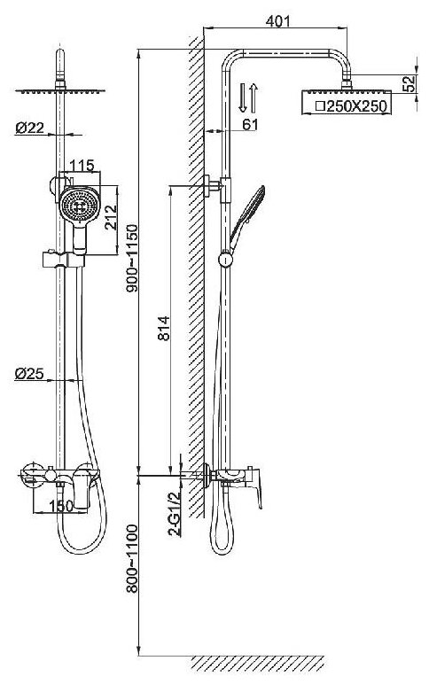 | Дополнительная информация | высота стойки для душа: 1150 мм; диаметр душевой лейки: 115 мм; длина верхнего душа: 250 мм; ширина верхнего душа: 250 мм |