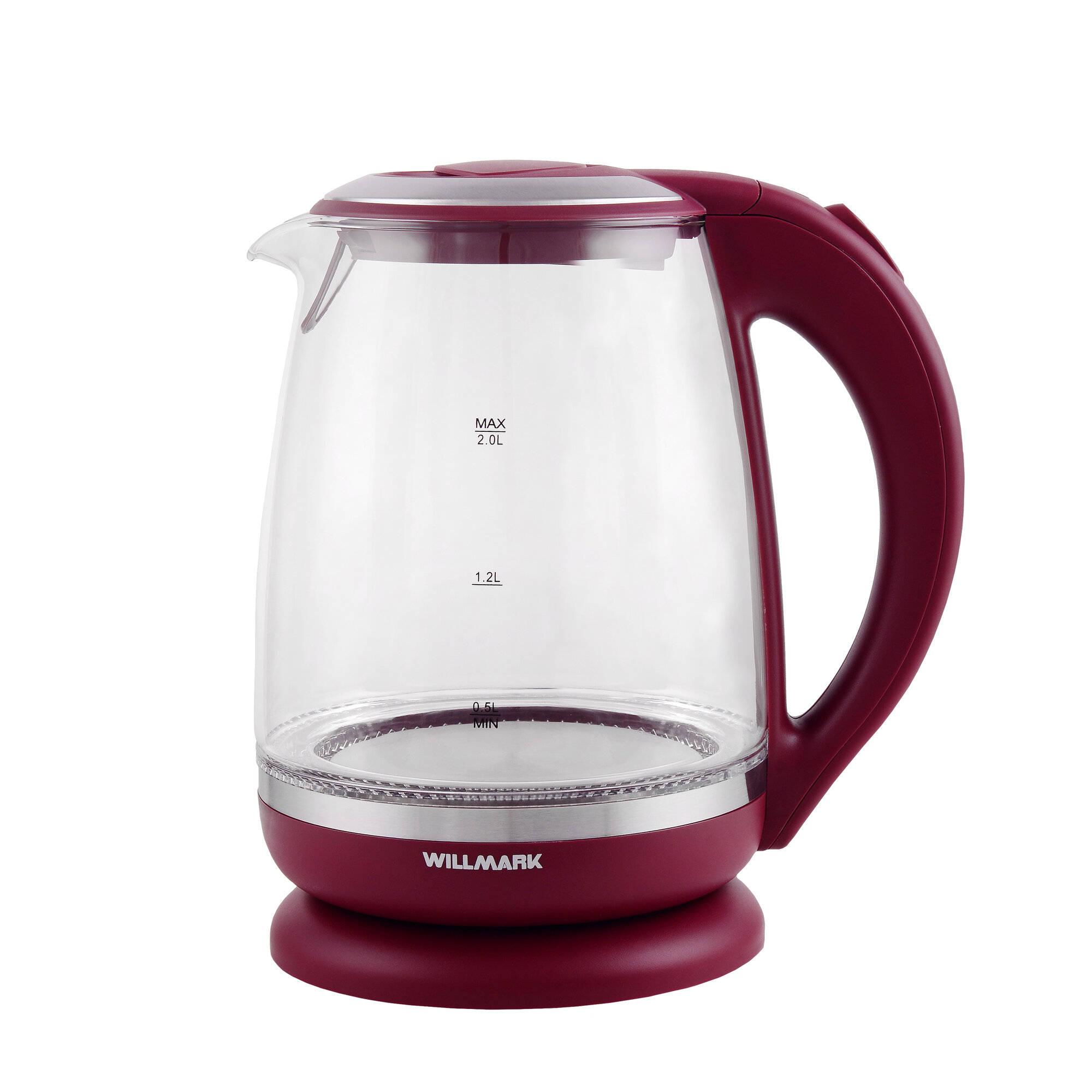 Чайник эл. WILLMARK WEK-2005G (2.0л, пов. на 360 град., LED-подсв., корп. из стекла, 2200Вт) Бордовый