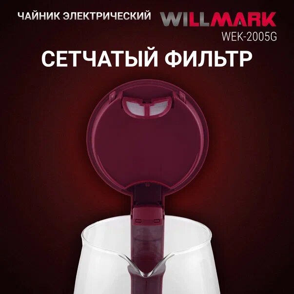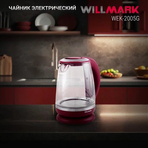 Чайник электрический Willmark Wek-2005g, стекло, 2 л, 2200 Вт, LED-подсветка, бордовый Willmark 7782 .