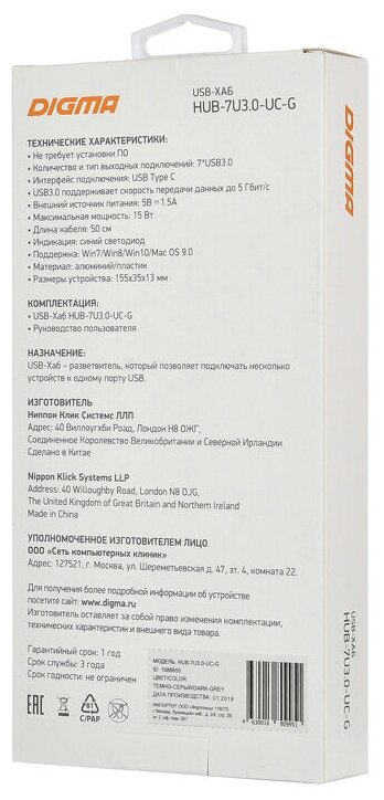 Разветвитель USB-C Digma HUB-7U3.0-UC-G 7порт. серый информация: