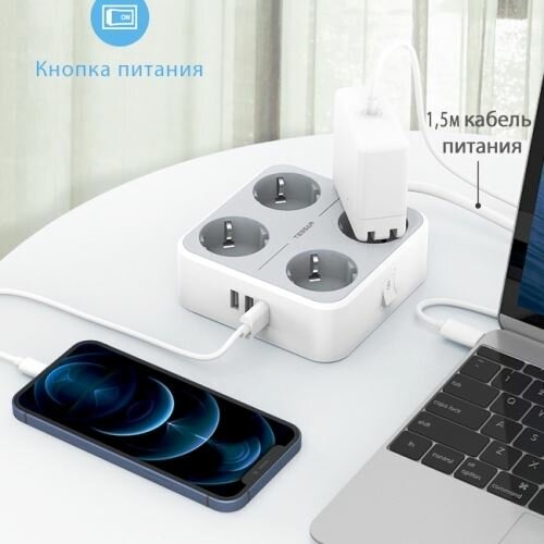 Сетевой фильтр без провода TESSAN TS-301-DE-C 3 розетки 2500 Вт + USB зарядка 2 порта до 3А + 1порт USB-C серый