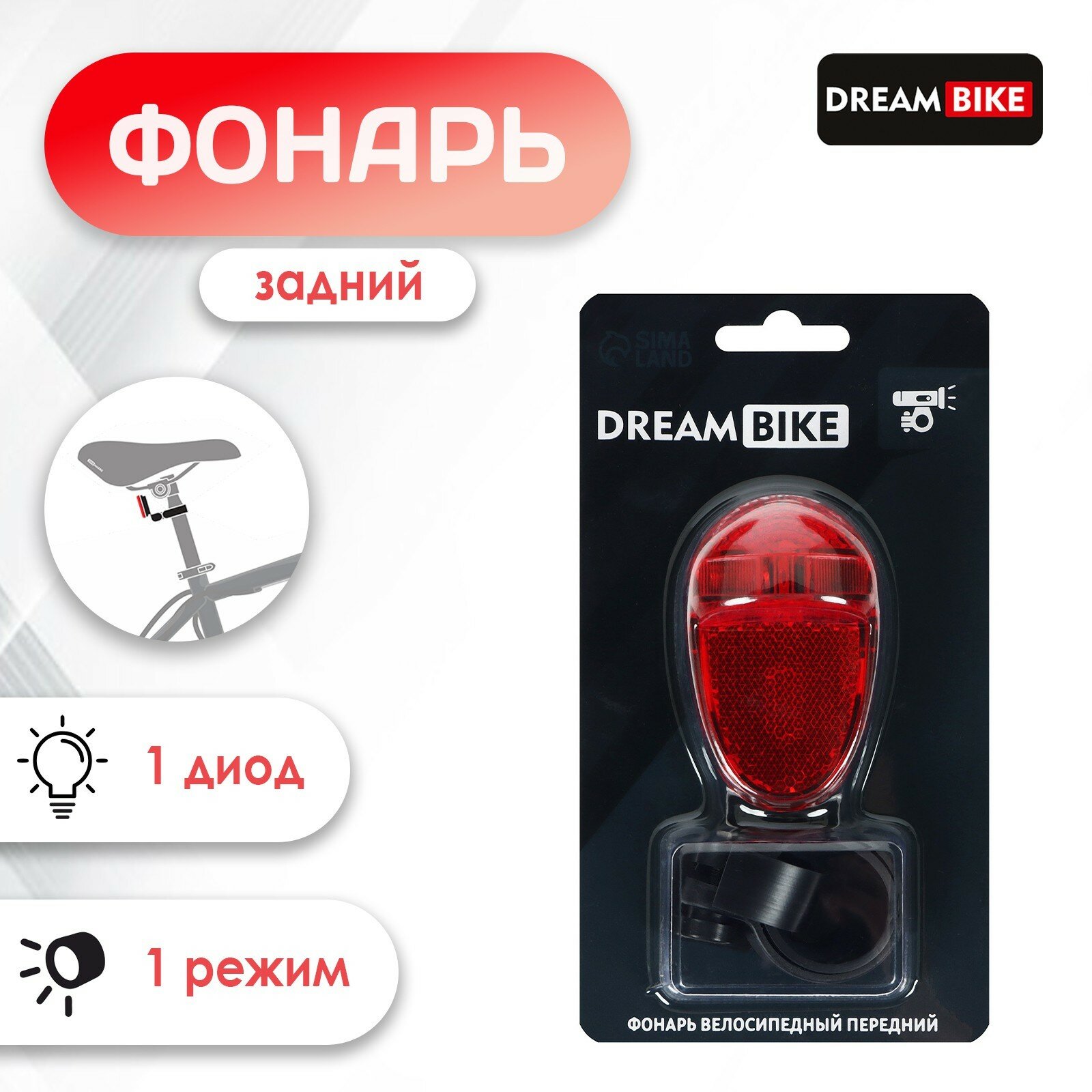 Фонарь велосипедный задний Dream Bike, JY-399T-1, 1 диод, 1 режим