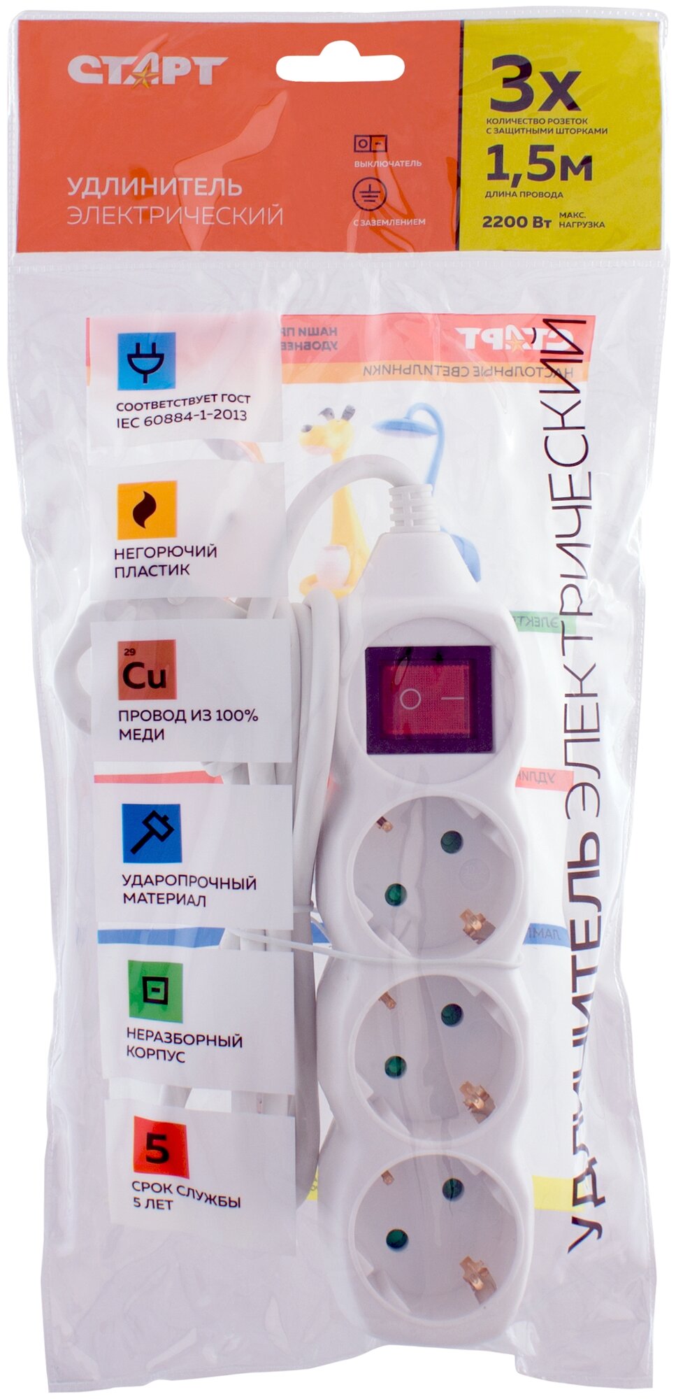 Удлинитель СТАРТ S 3х1, 3 розетки, 1.5 м, б/з, 10А / 2200 Вт