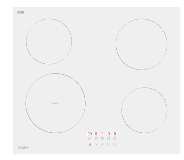 Индукционная стеклокерамическая варочная панель Evelux HEI 641 W, 9 уровней мощности, 4 конфорки Booster, кнопка блокировки панели, таймер конфорок, защита от перегрева 30 990 ₽