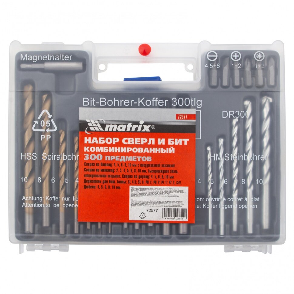 Набор сверл комбинированный: бетон 4-10 мм, металл 2-10 мм, дерево 4-10 мм, дюбеля, 300 предметов Matrix 72577 информация: