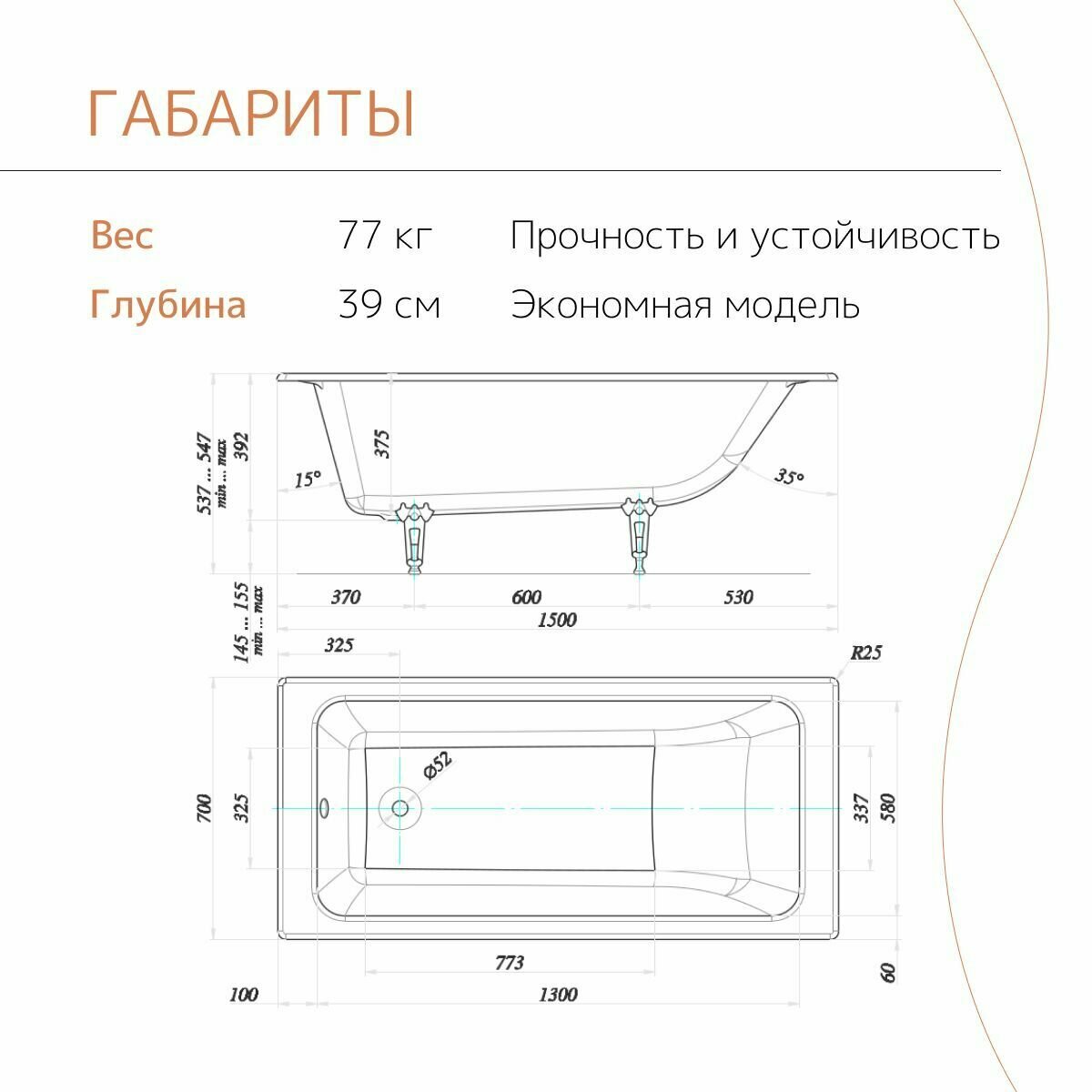 Ванна чугунная tempra Stil 150x70 круглые ручки информация: