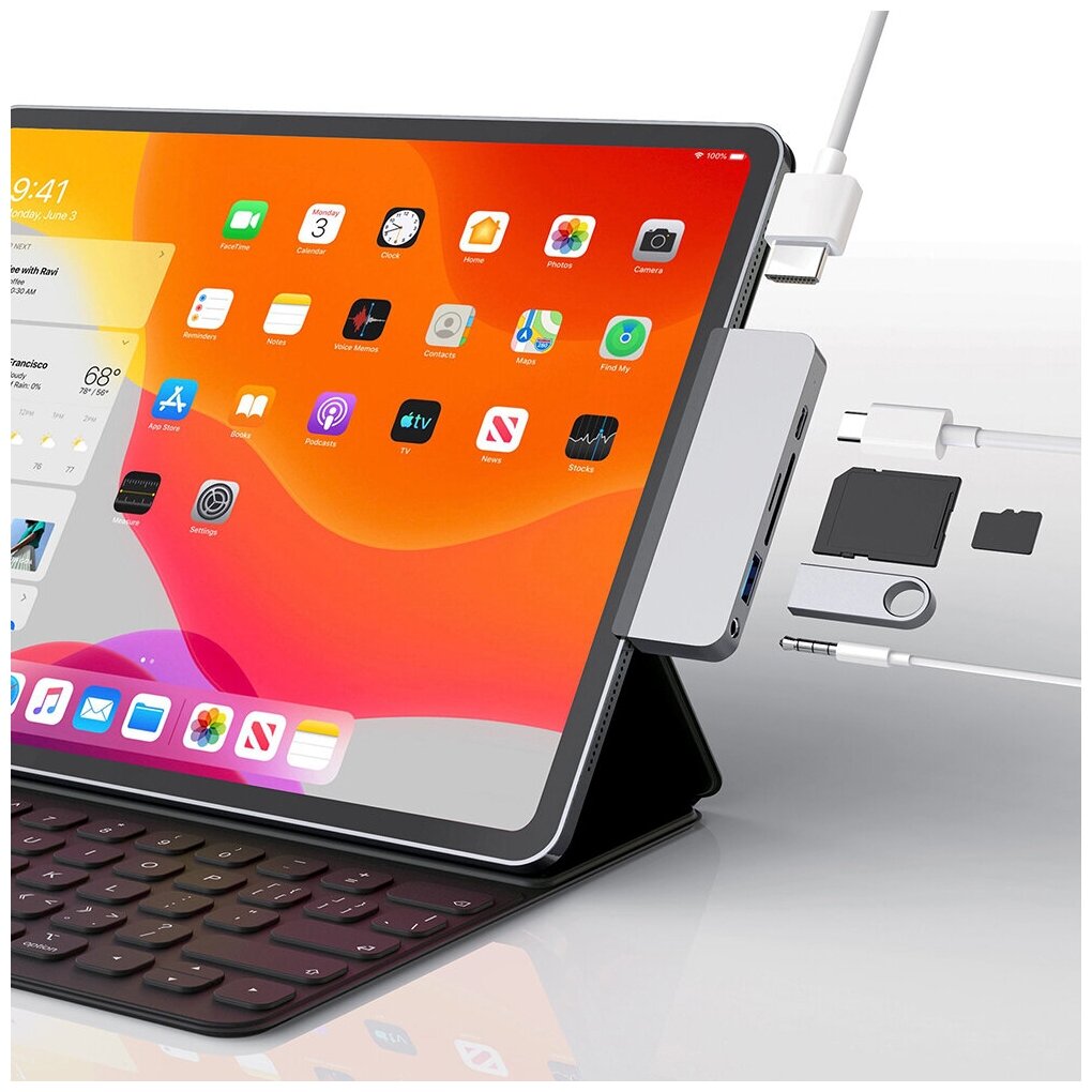 USB хаб Hyper HyperDrive 6-in-1 USB-C Hub для iPad Pro. Порты: HDMI 4K60Hz, USB-C 5Gbps 60W, MicroSD UHS-I 104MB/s, SD UHS-I 104MB/s, USB-A 5Gbps, 3.5mm Audio Jack. Цвет: серебряный. информация: