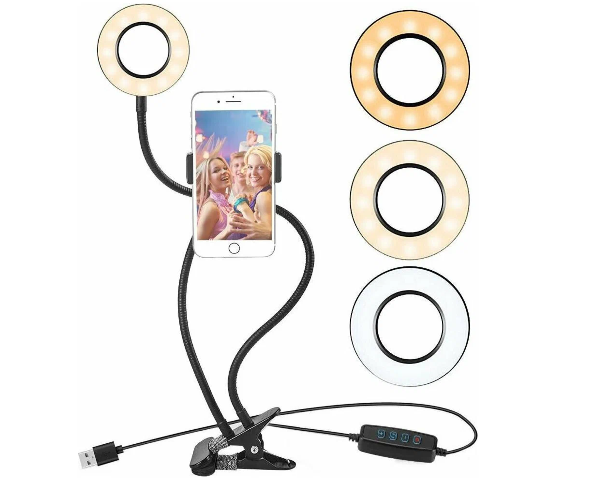 10 цен на Селфи кольцо (кольцевая лампа) 8,5 см с держателем для смартфона на гибком штативе.
