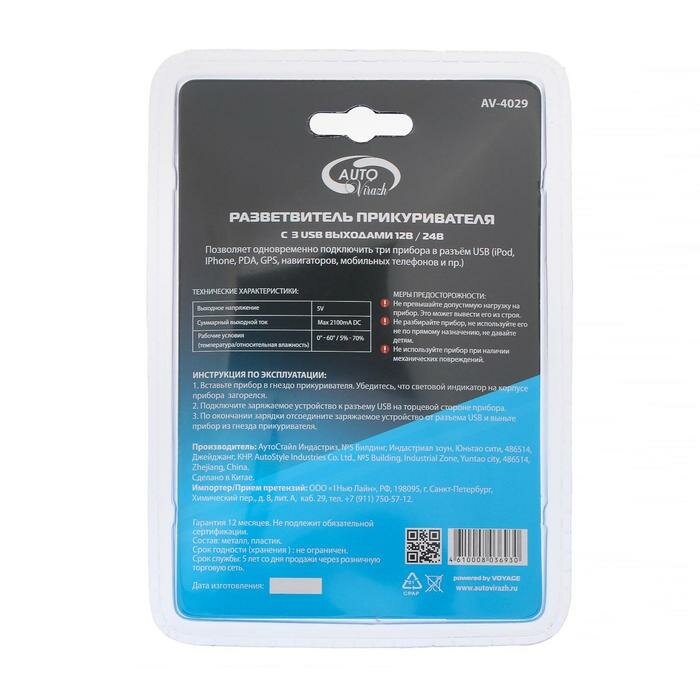 Разветвитель прикуривателя Autovirazh 3 USB, 12/24V, AV-4029./В упаковке шт: 1 информация: