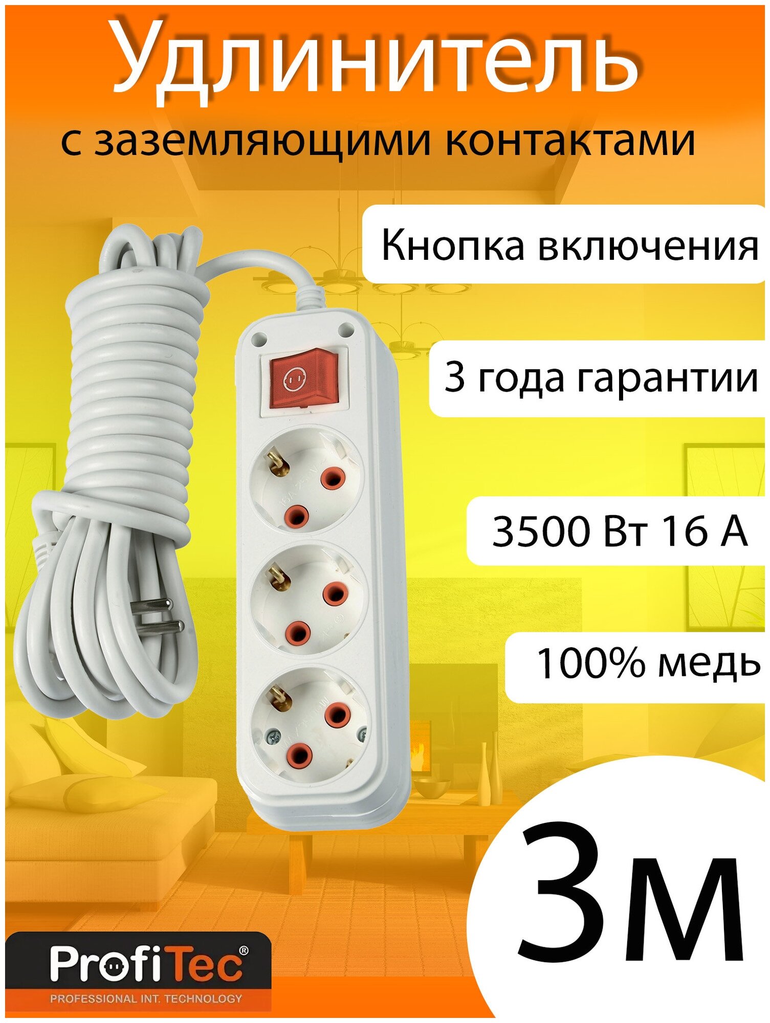 10 цен на Бытовой удлинитель электрический Profitec Сетевой шнур TURBO 3 гнезда розетки, с заземлением, с кнопкой, длина 3м, 16А, медь 100%. №G02 0159 0313S