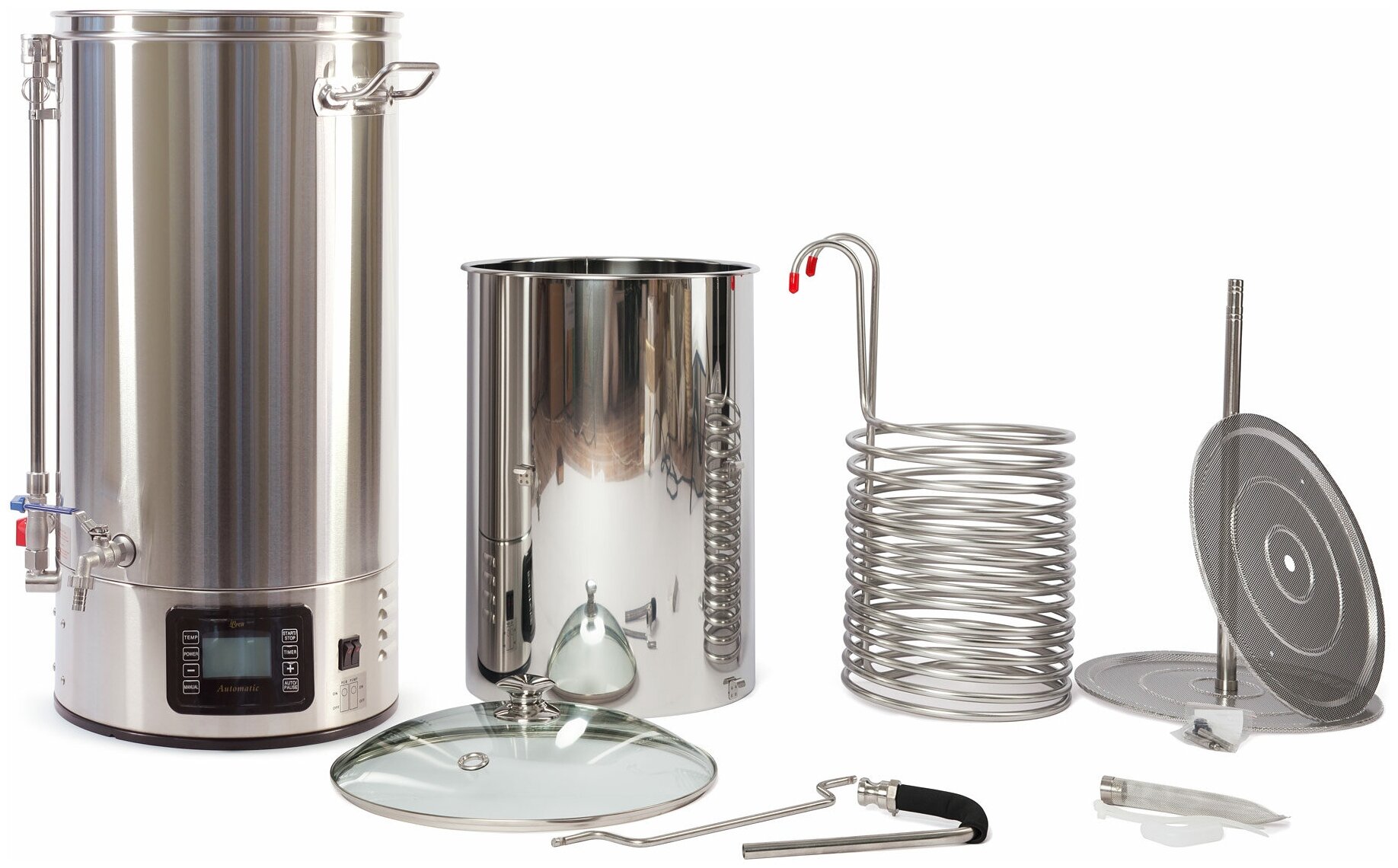 | Дополнительная информация | варочная ёмкость с краном и встроенным насосом, металлическая трубка излива для циркуляции сусла, корзина для солода (бункер с трубкой, 2 перфорированных сита), фильтр «базука», чиллер диаметром 9.5 мм и длиной 13 м, сохранение рецептов в памяти, автоматический и ручной режимы работы |