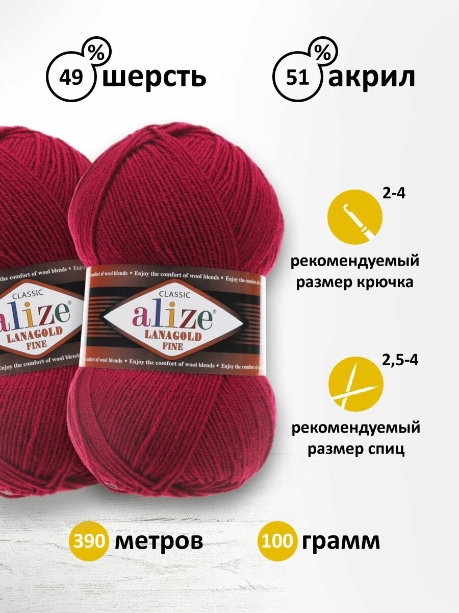 Пряжа для вязания ALIZE LANAGOLD FINE: 57 (бордовый), 5 шт 390 м 100 г, 49% шерсть 51% акрил