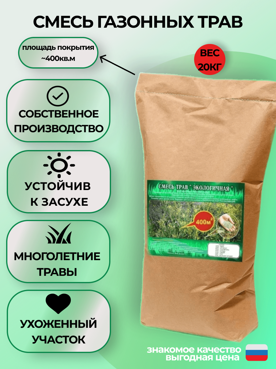Семена газонной травы "Зеленый Метр", смесь семян газонных трав "Смесь трав "Экологичная", 20 кг информация:
