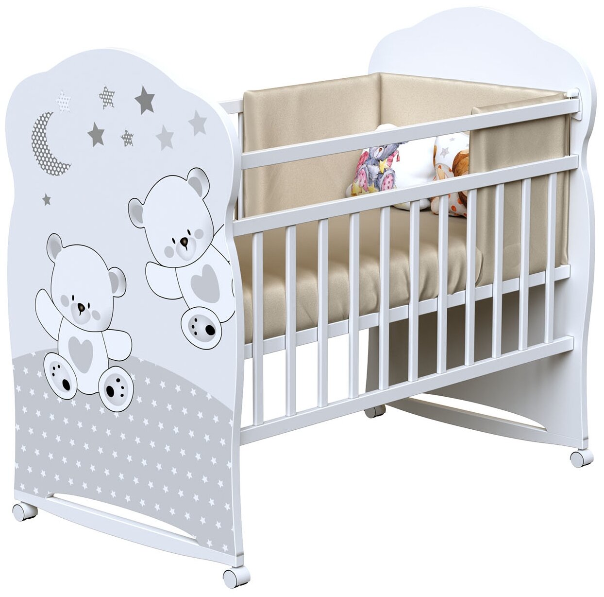 Кроватка детская для новорожденных ВДК Funny Bears, колесо-качалка, массив березы, белый
