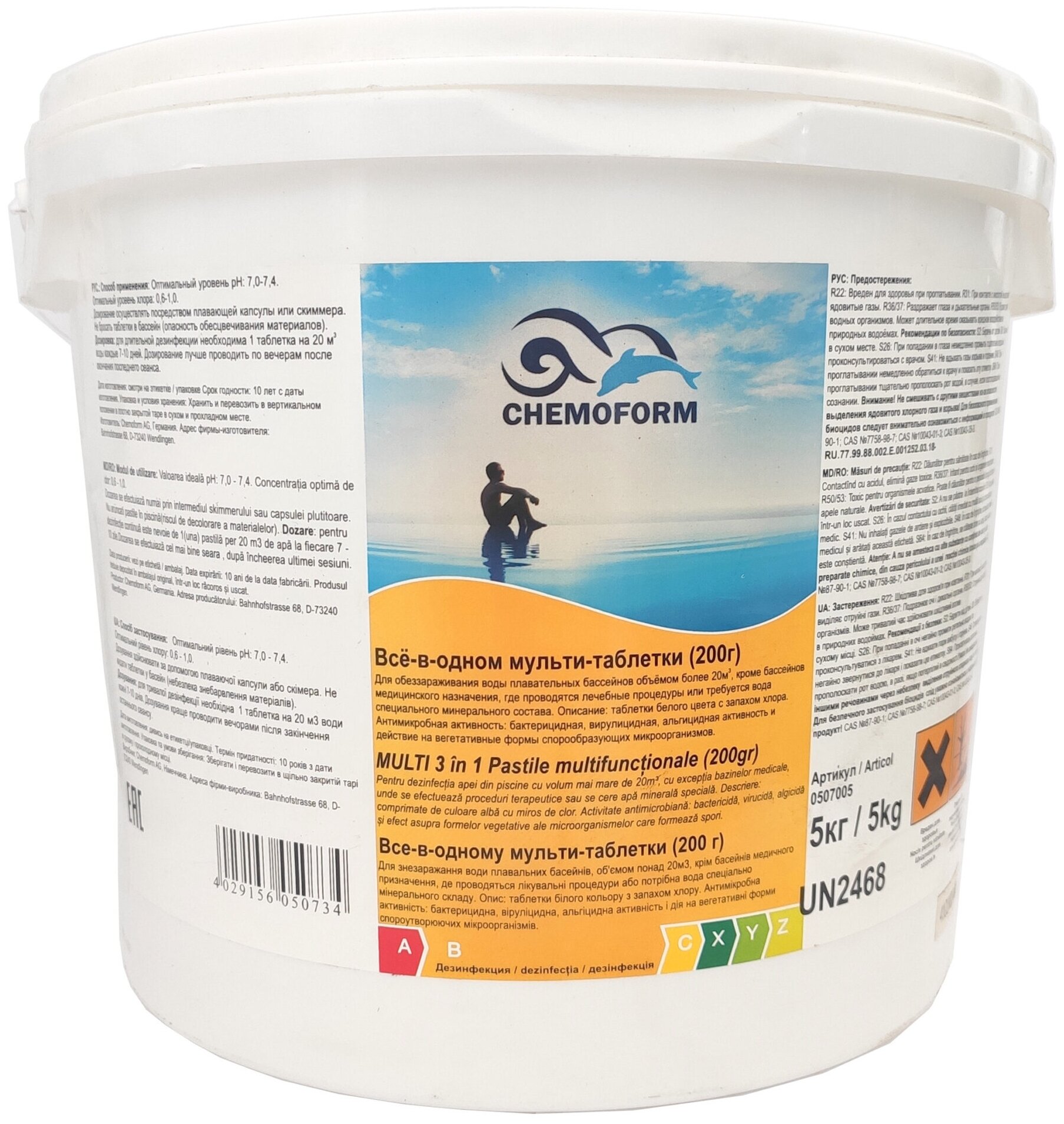 Многофункциональные 3 в 1 медленнорастворимые стаб. таблетки хлора 80% для бассейна, табл.200гр., 5кг. CHEMOFORM