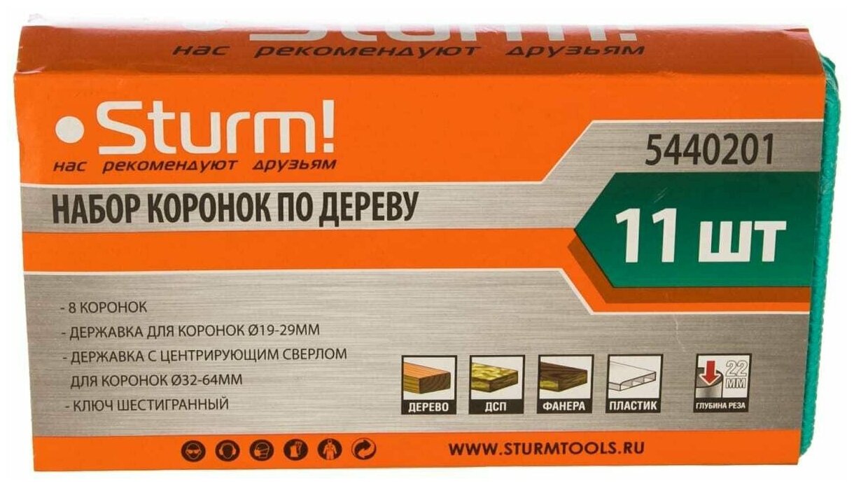 Набор коронок по дереву Sturm 5440201 /11 предм., D19,22,29,32,38,44,51,64мм /69254/