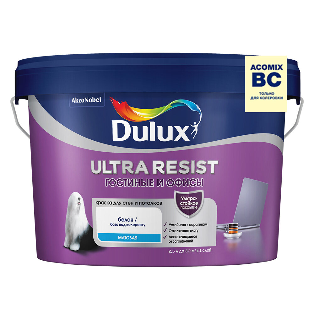Краска для стен и потолков Dulux Ultra Resist Гостиные и Офисы база BW, белая, матовая (2,5л)