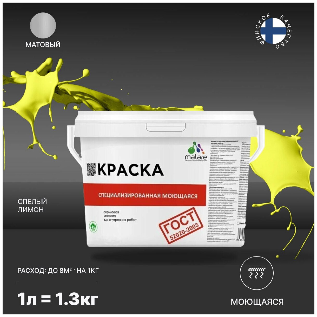 Краска Malare "ГОСТ" моющаяся интерьерная для стен и обоев, потолка, деревянных и минеральных поверхностей, универсальная быстросохнущая без запаха матовая, cпелый лимон, (1л - 1.3кг). информация: