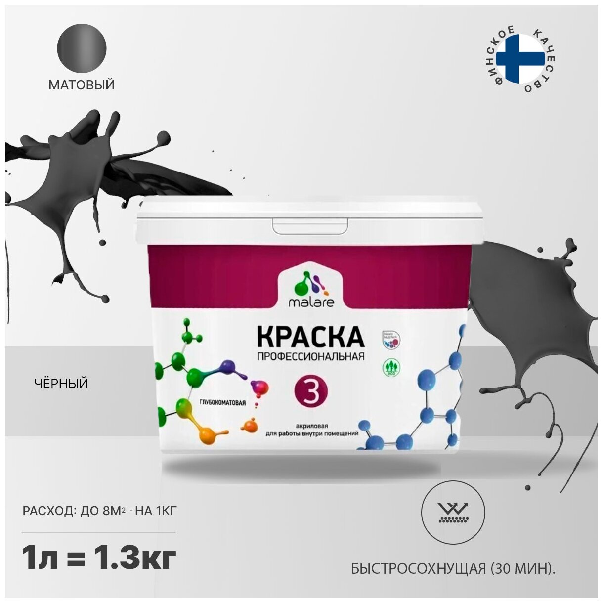 Краска Malare Евро №3 для обоев, стен и потолков, интерьерная, универсальная, быстросохнущая, без запаха, матовая, черный, (1л - 1.3кг). информация:
