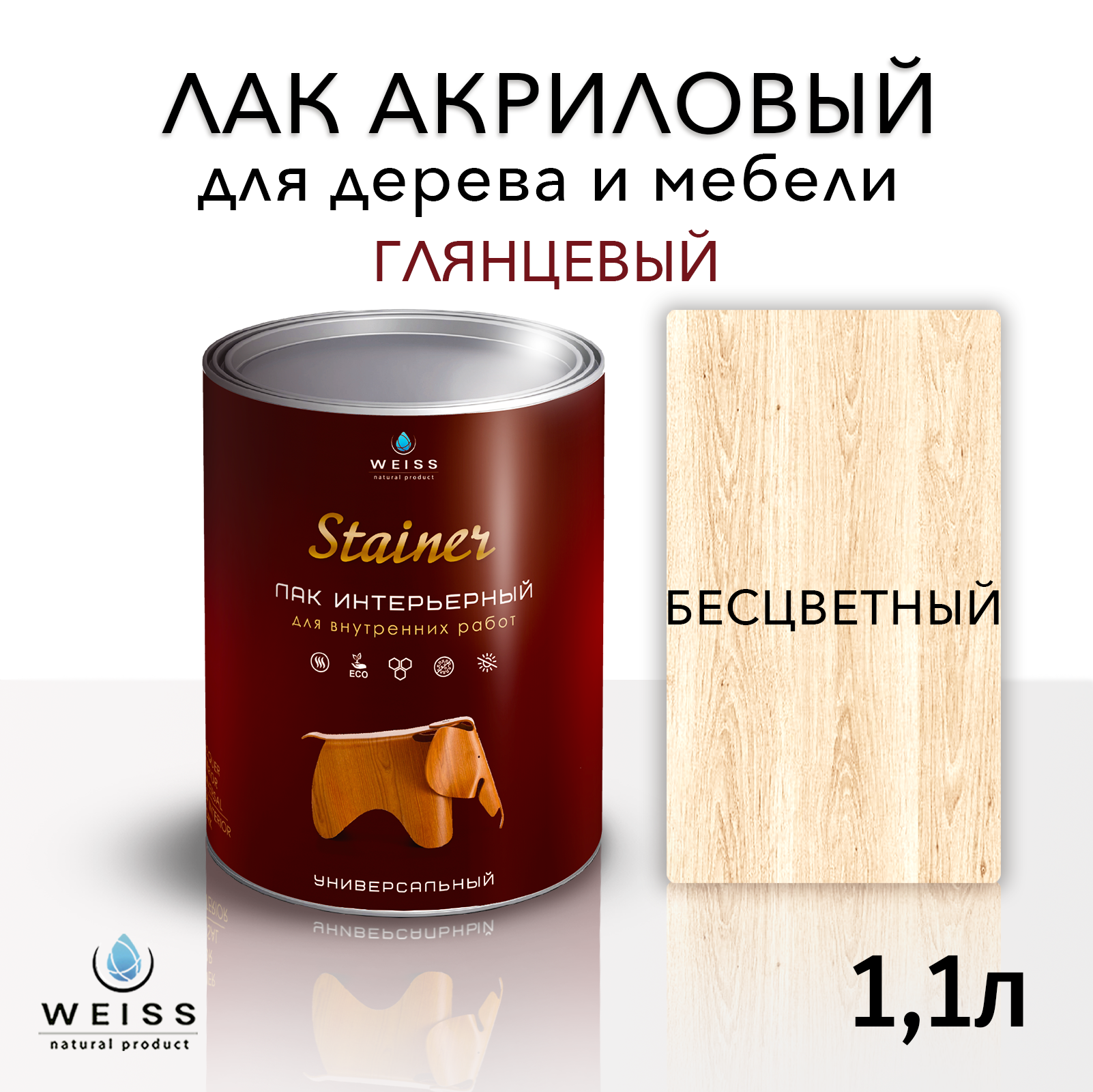 Лак для дерева акриловый бесцветный, глянцевый, Weiss natural product, без запаха, самовыравнивающийся, 1.1л 850 ₽