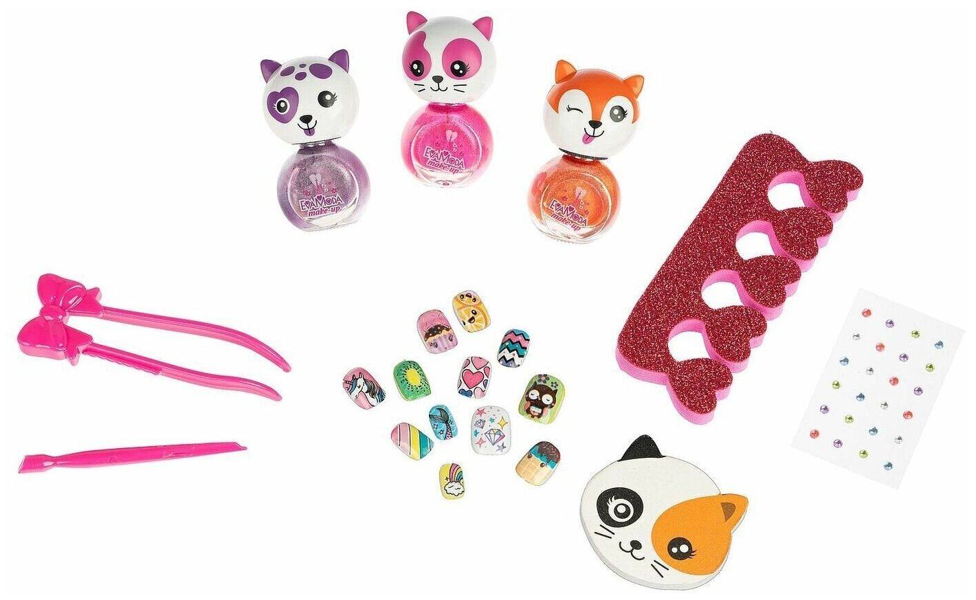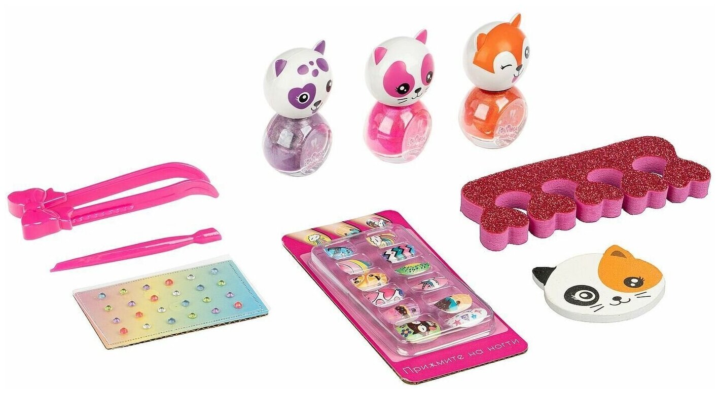 Набор для маникюра и педикюра: 3 оттенка лака для ногтей , стразы, накладные ногти и инструменты Eva Moda Bondibon подарок девочке