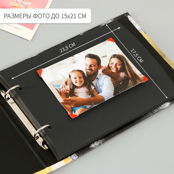 Фотоальбом на кольцах 30 листов "Фотоаппарат на плитке" чёрные листы 18х18 см 874 ₽