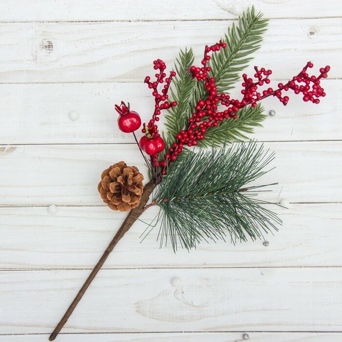 Еловая ветка новогодняя "Зимнее волшебство. Мечты", пластик, ягоды, шишка, 30 см