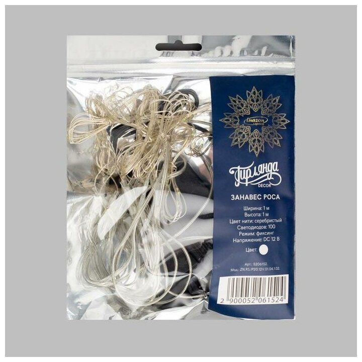 Гирлянда "Занавес" 1 х 1 м роса, IP20, серебристая нить, 100 LED, свечение белое, 12 В информация: