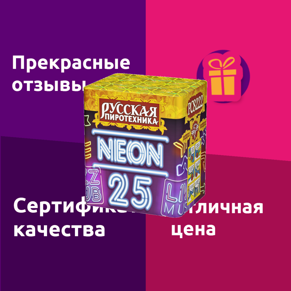 Отзывы на Салют фейерверк NEON-25 новогодний Русская пиротехника РС8222, батарея 25 залпов, калибр 1.25, 30 секунд