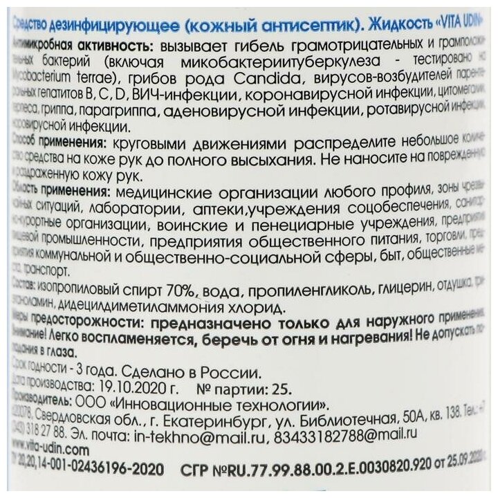 VITA UDIN антисептик для РУК 100 МЛ VU100 информация: