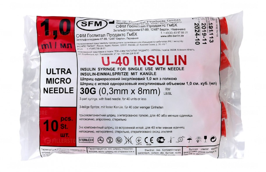 Шприц с иглой одноразовый инсулиновый SFM U-40 30G 0,3мм x 8мм 1мл 10шт