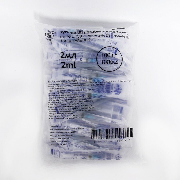 Шприц 2,0 мл трехкомпонентный с иглой 23G Хуайань информация: