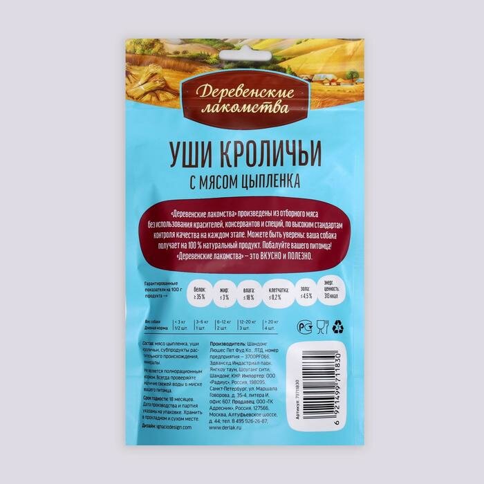 Уши кроличьи "Деревенские лакомства" для щенков, с мясом цыпленка, 90 г информация: