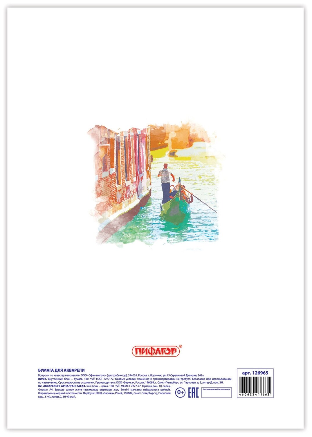 Папка для акварели, А4, 10 л., 180 г/м2, пифагор, 210х297 мм, ГОСТ 7277-77, 126965 информация: