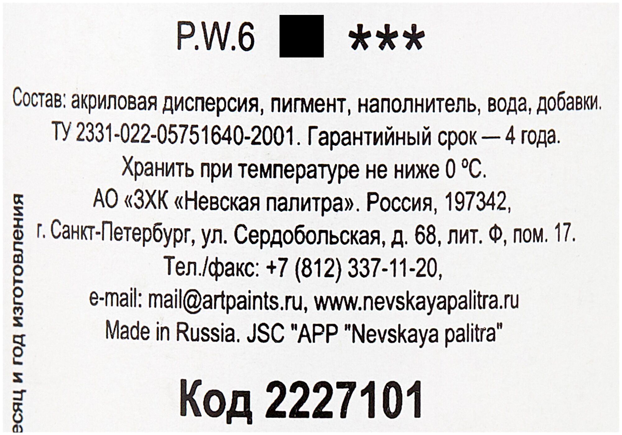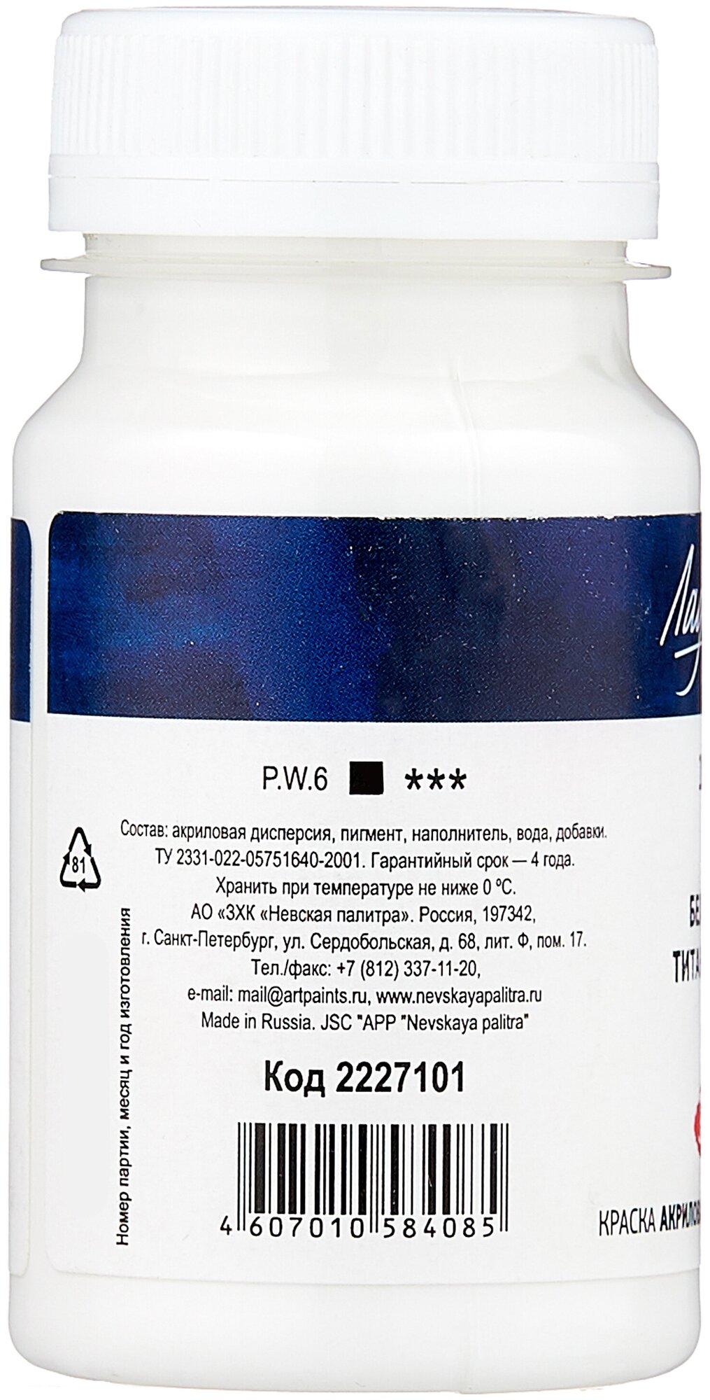 Завод художественных красок «Невская палитра» Краска акриловая художественная в банке 100 мл, ЗХК "Ладога", белила цинковые, 2227100