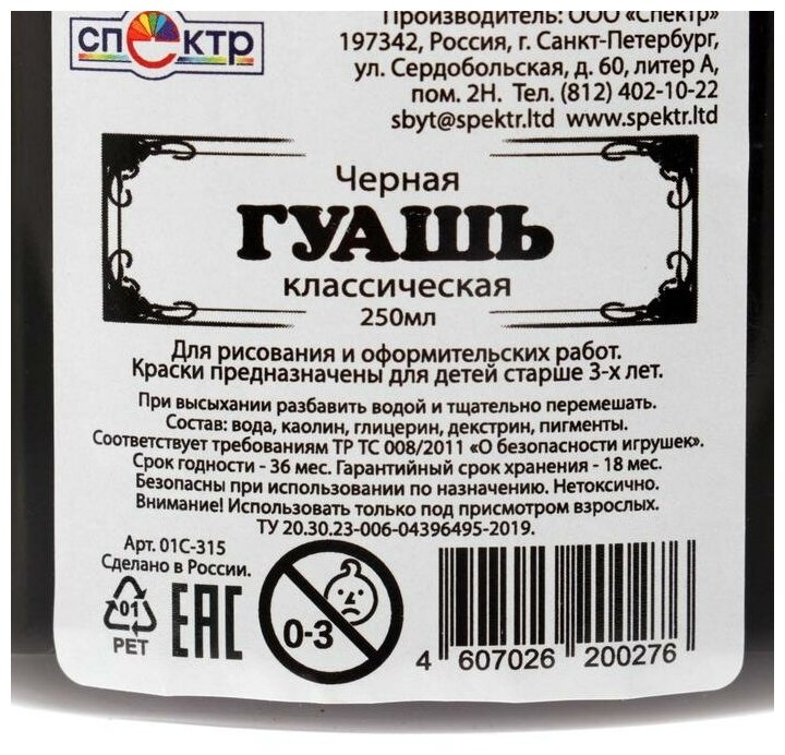 Гуашь художественная «Спектр», 220 мл, чёрная, в банке информация: