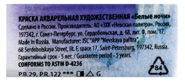 Акварель художественная"Белые ночи", 2.5 мл, сиреневая дымка, в кювете Завод художественных красок информация: