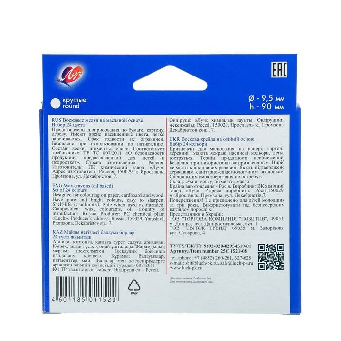 Луч Мелки восковые 24 цвета «Фантазия», круглые, микс информация: