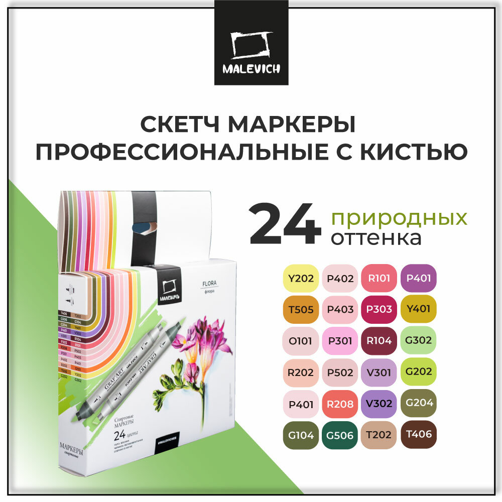 Набор спиртовых маркеров Малевичъ "Graf'Art Brush. Флора", 24 цвета информация: