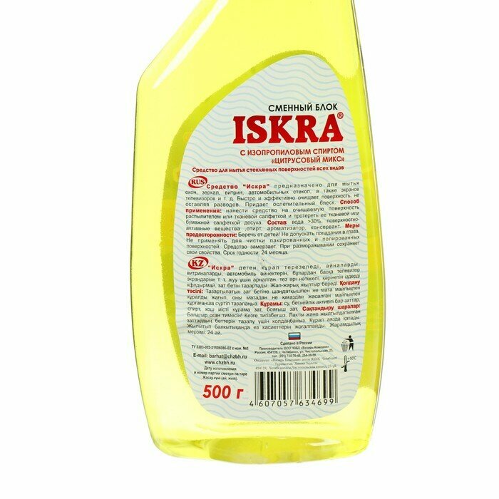 Средство для мытья стекол и зеркал Barhat Iskra, цитрусовый микс, с изопропиловым спиртом, без распылителя, 500 мл./В упаковке шт: 1 информация: